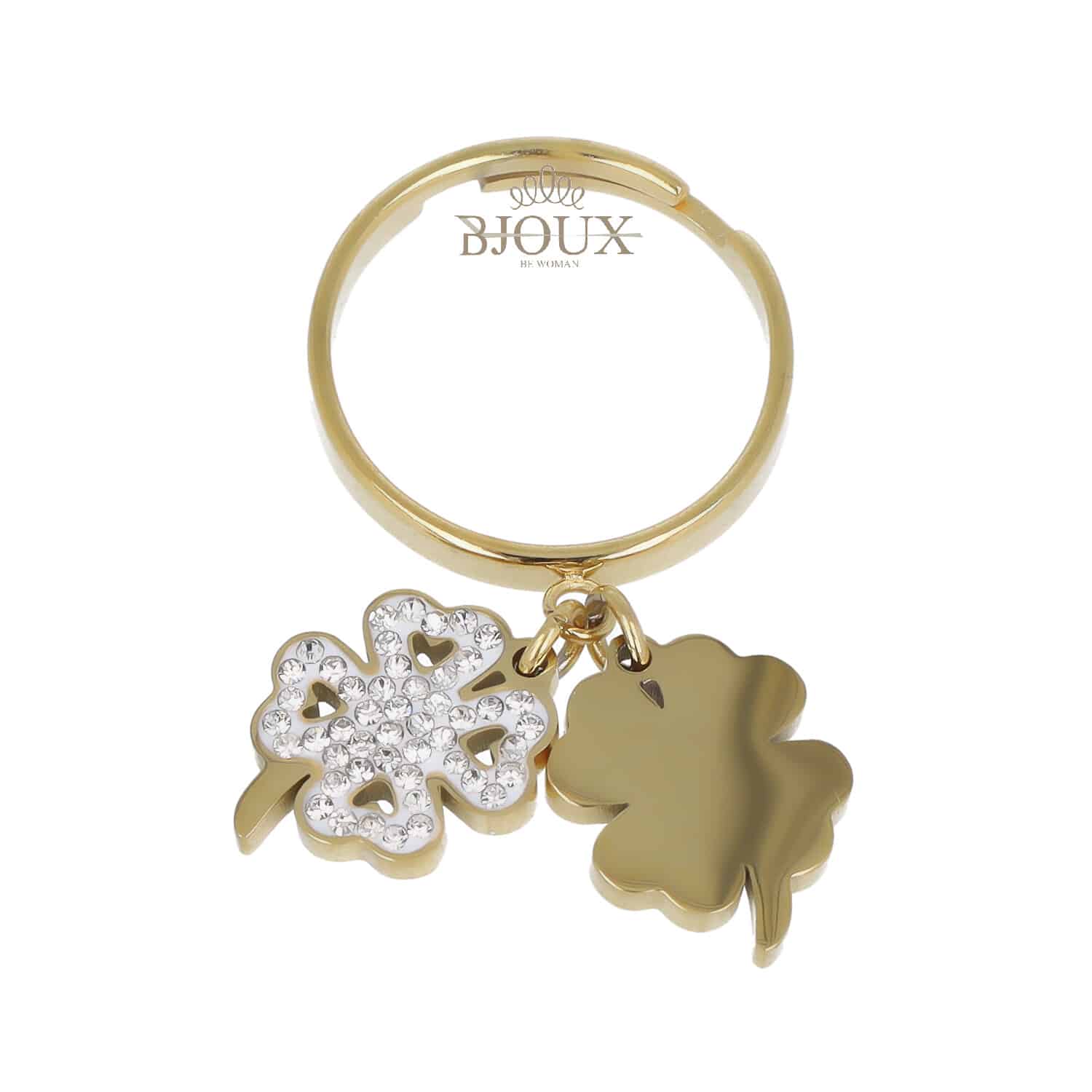 Anello di bigiotteria in acciaio inossidabile misura regolabile con pendenti quadrifogli con strass