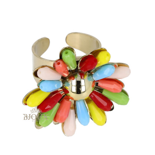 Anello di bigiotteria in acciaio inossidabile fascia con misura regolabile, con fiore maxi decorato da pietre , diametro 3 cm