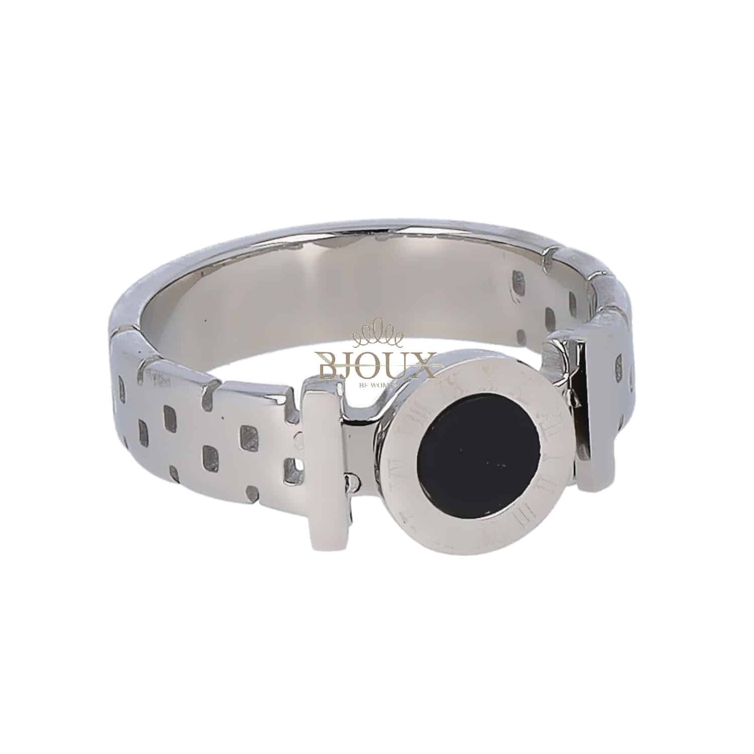 Anello di bigiotteria in acciaio inossidabile. Anello fascia con fibra nera e centrale tondo.