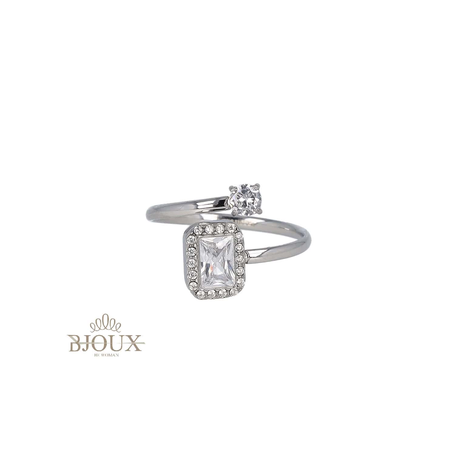 Anello in acciaio inossidabile anallergico con fascia aperta regolabile. Anello con punto luce e pietra rettangolare con strass