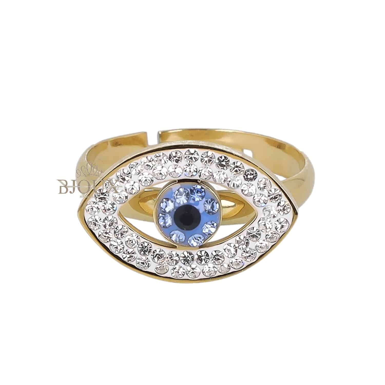 Anello in acciaio inossidabile con fascia di misura regolabile decorato con centrale occhio con strass bianchi e azzurri