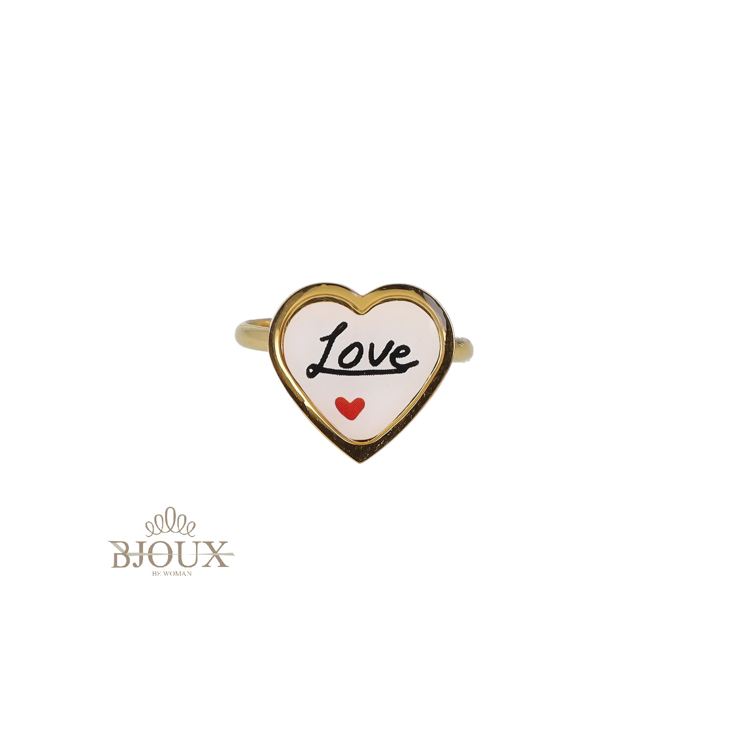 Anello a cuore con scritta Love e piccolo cuore rosso. Un modello essenziale, sempre attuale e perfetto per ogni occasione.