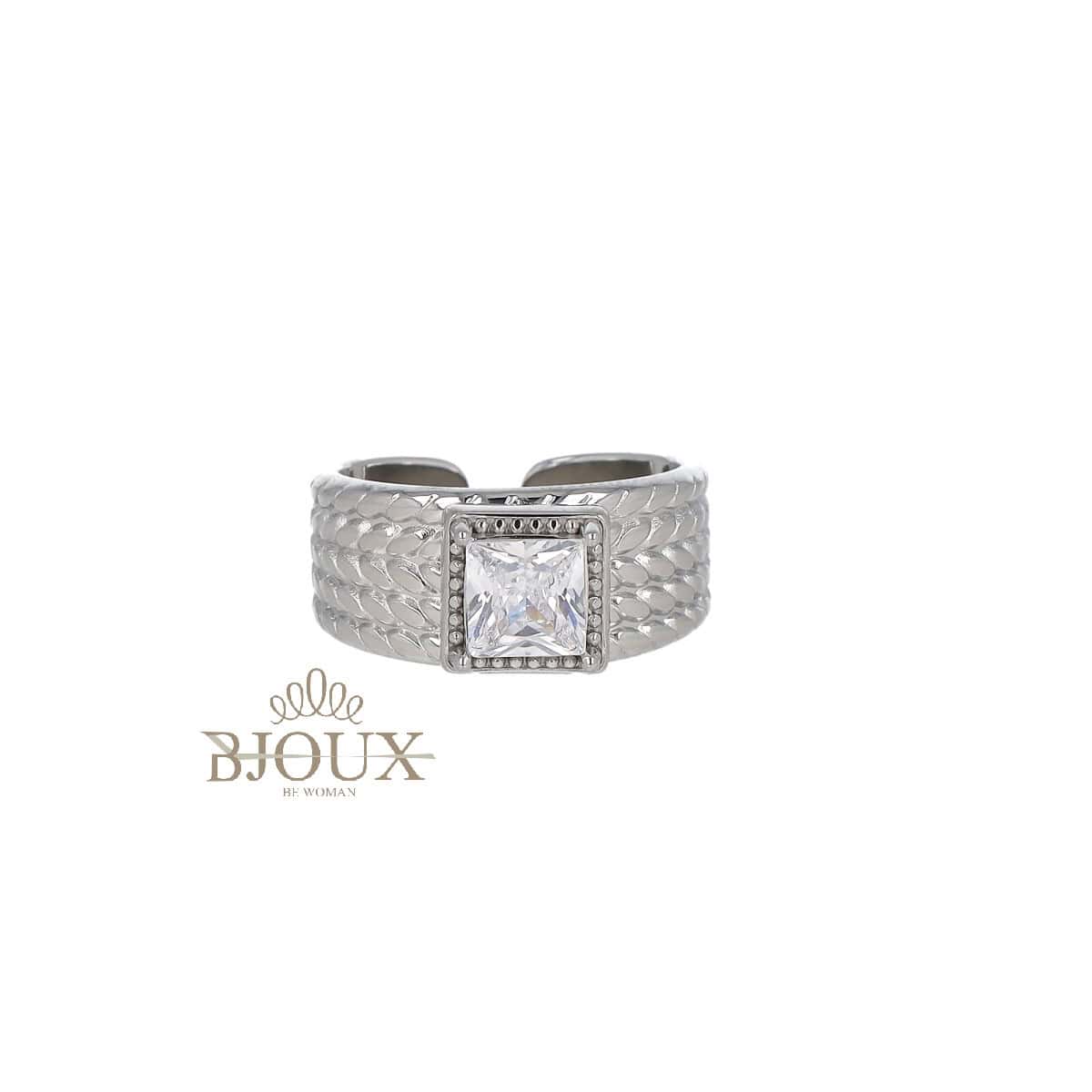 Anello acciaio misura regolabile. Anello donna con fascia aperta e regolabile. Anello fascia lavorata con zircone taglio quadrato