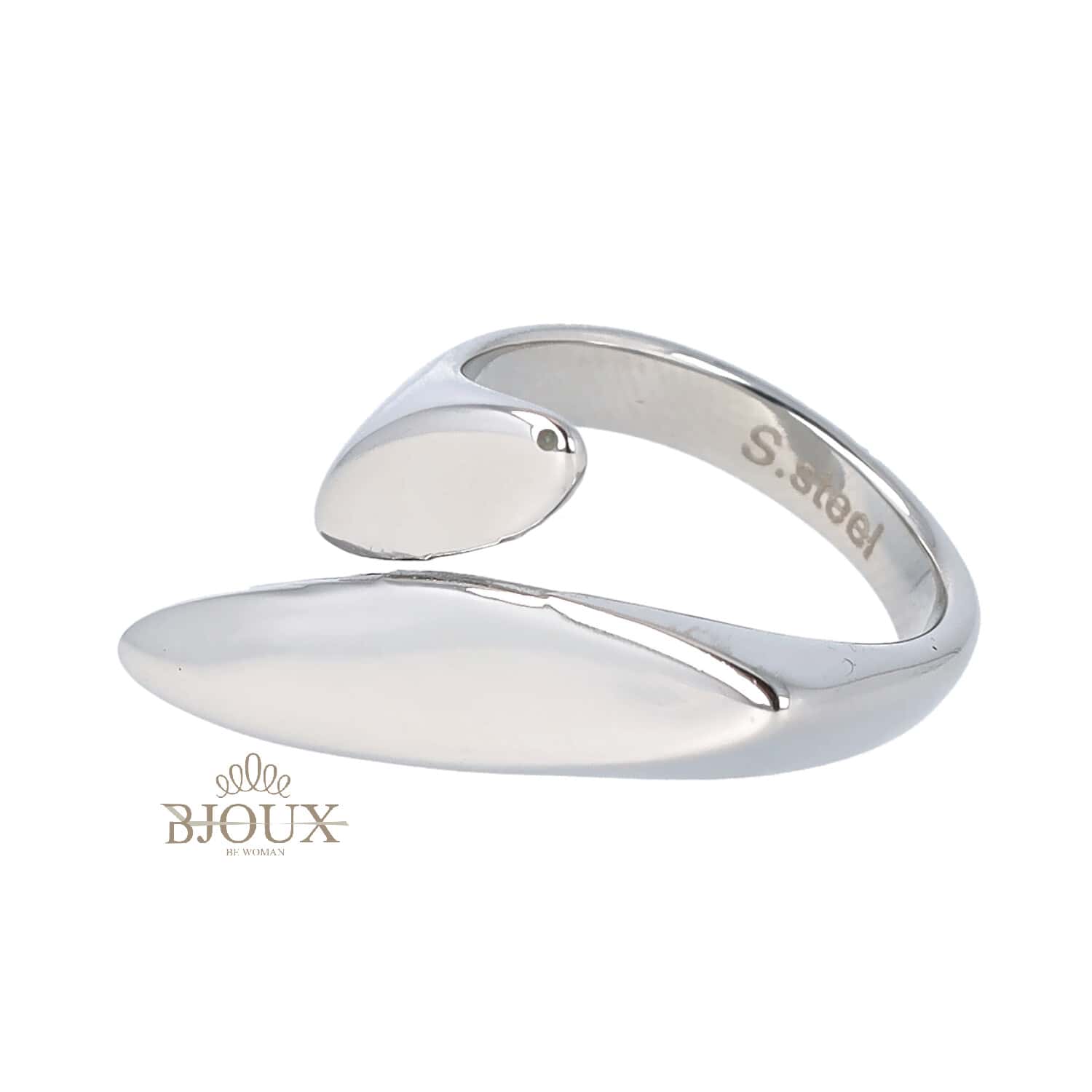 Anello di bigiotteria in acciaio inossidabile fascia con misura regolabile. Fascia a due elementi asimmetrici, liscio