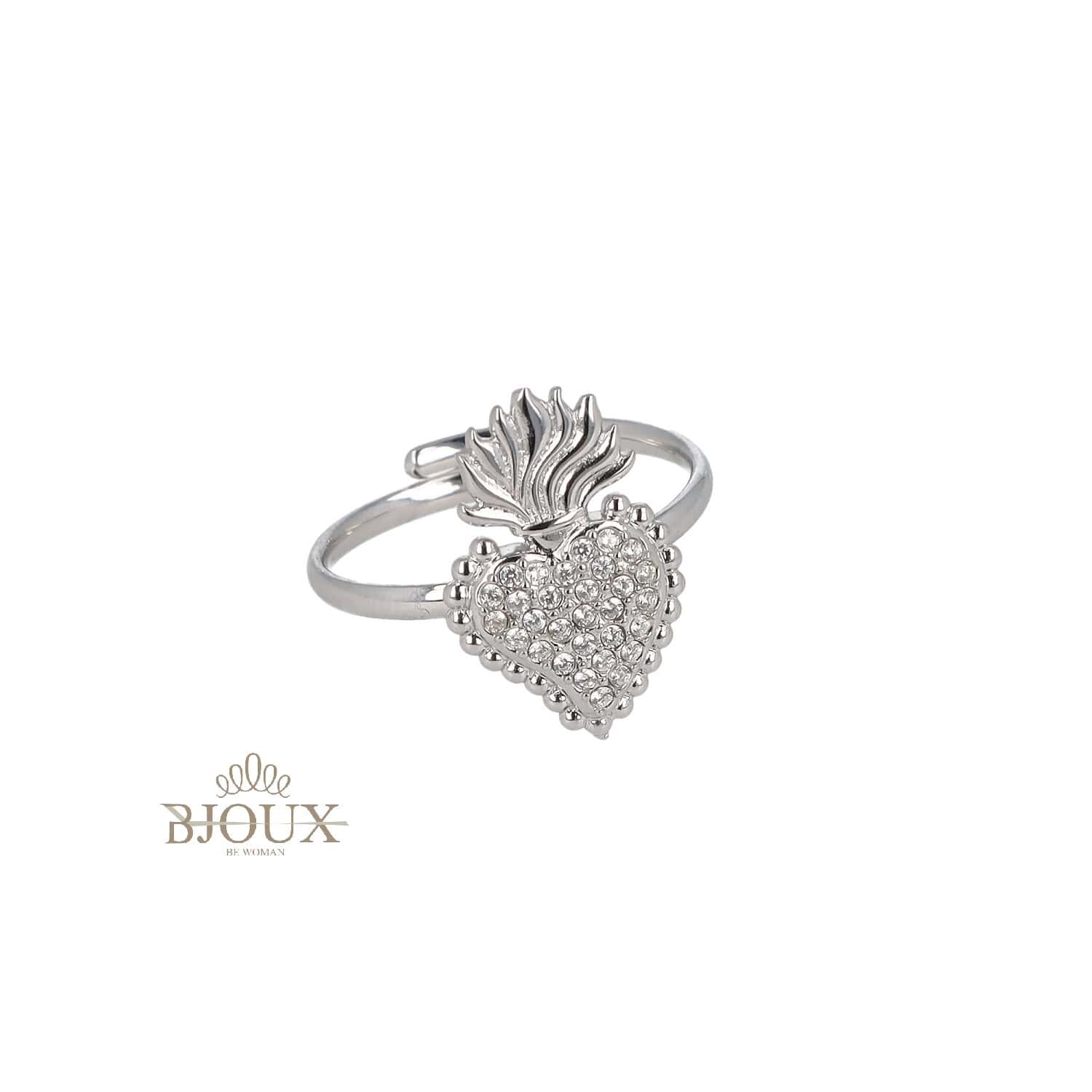 Anello in acciaio inox con cuore sacro centrale tempestato di zirconi e fiamma superiore. Design raffinato, misura regolabile. Misura 1,5 cm