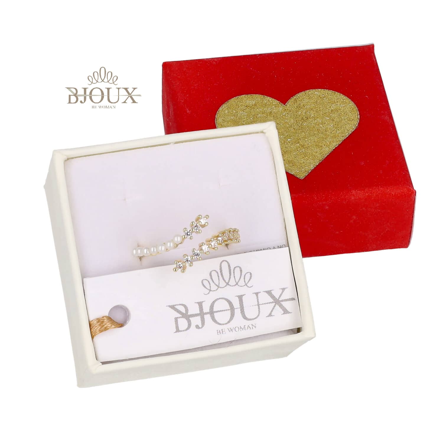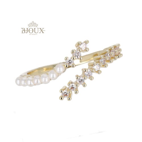 Anello di bigiotteria in ottone dipinto con fascia a misura regolabile. Filo di perle e strass kry. Astuccio regalo 5×5