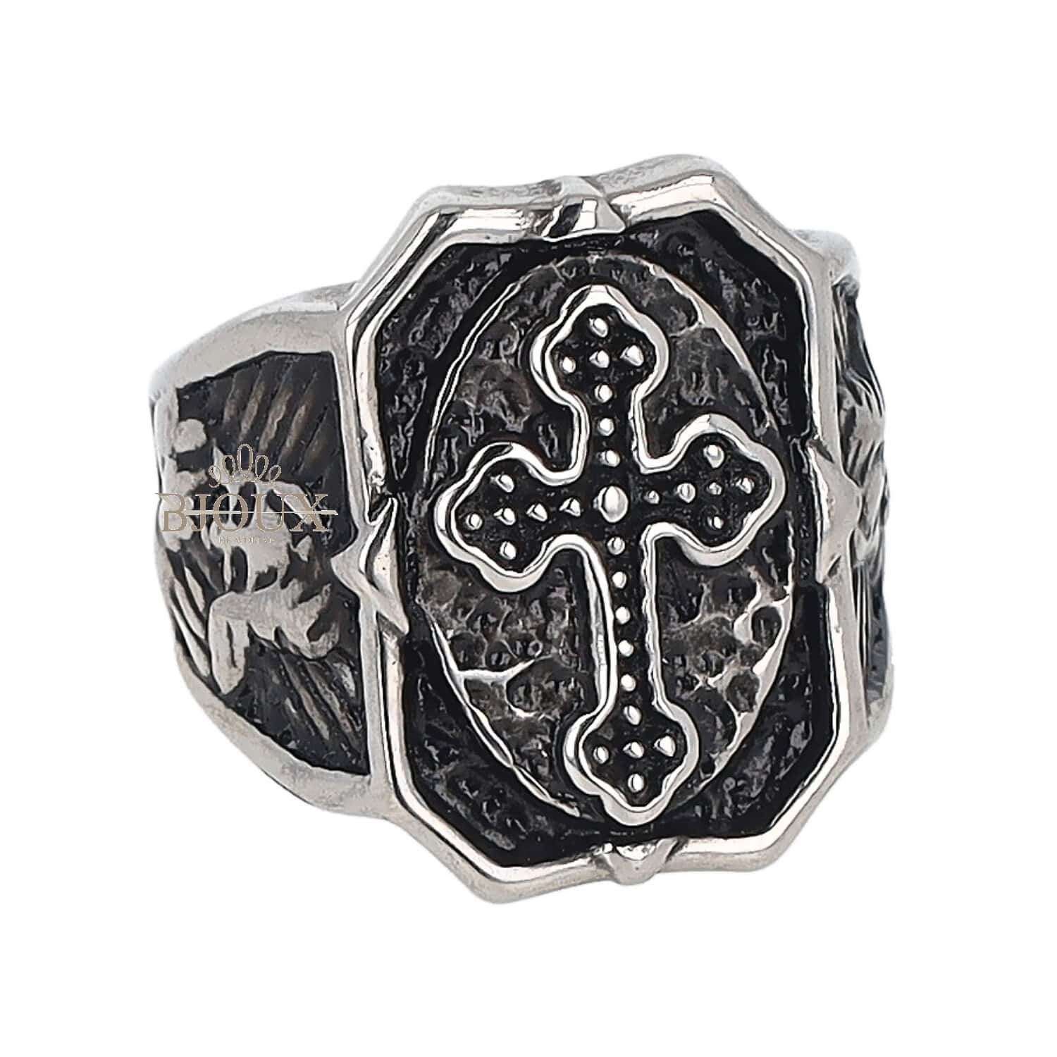 Anello in acciaio inossidabile per uomo. Anello a fascia a misura con decori con centrale croce stilizzata. Fornito con astuccio regalo 7×7.
