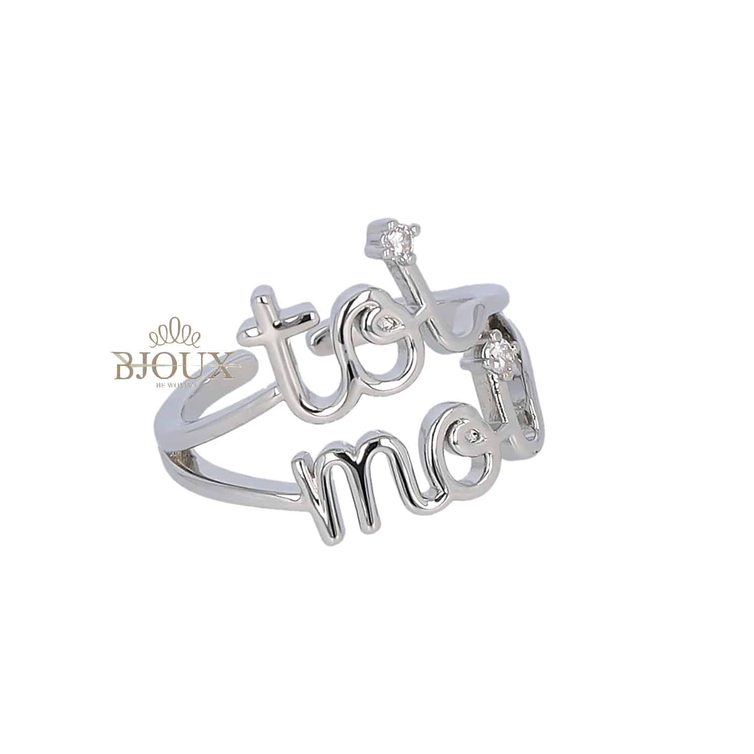 Anello con fascia aperta regolabile in ottone. Scritta toi e moi con castone strass. Disponibile in oro o in rodio.