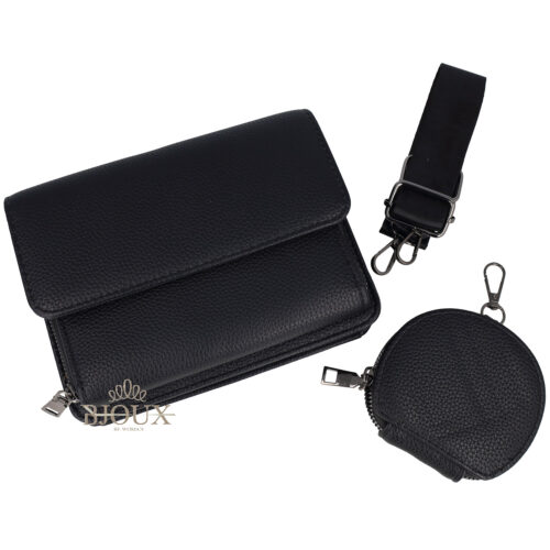 Borsetta da donna con chiusura a bottone e scomparto sul davanti, completa di borsellino tondo con gancio e tracolla colorata . Misure 18 x 14 x 7,5 cm
