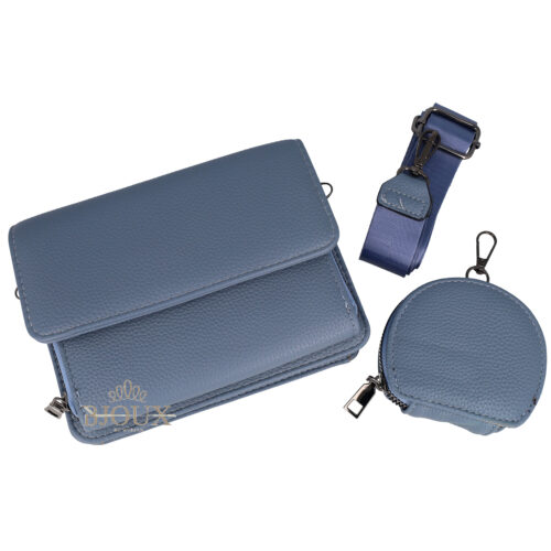 Borsetta da donna con chiusura a bottone e scomparto sul davanti, completa di borsellino tondo con gancio e tracolla colorata . Misure 18 x 14 x 7,5 cm