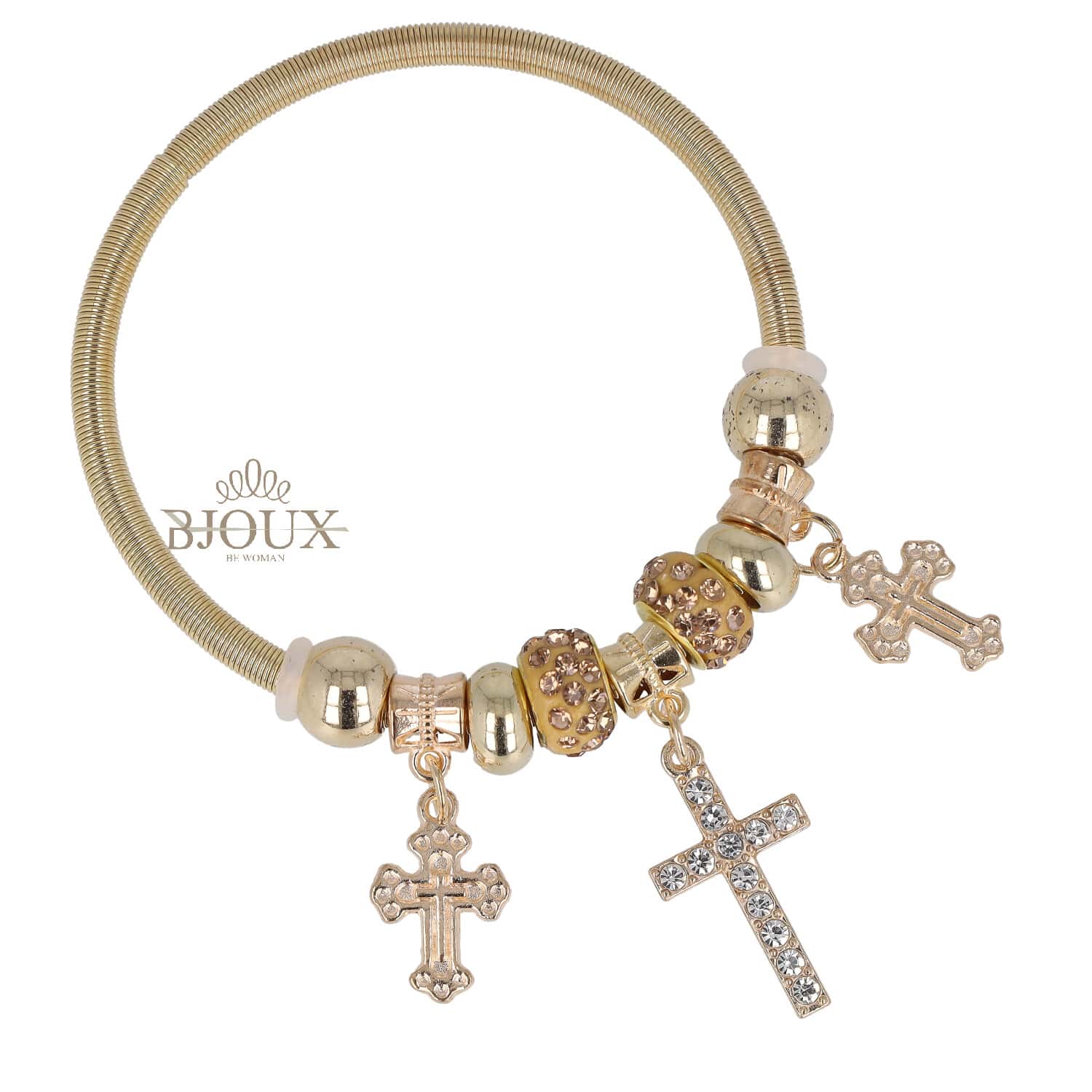 Bracciale bigiotteria in ottone dipinto. Modello a molla con charms e beads colorati. Pendenti crocette