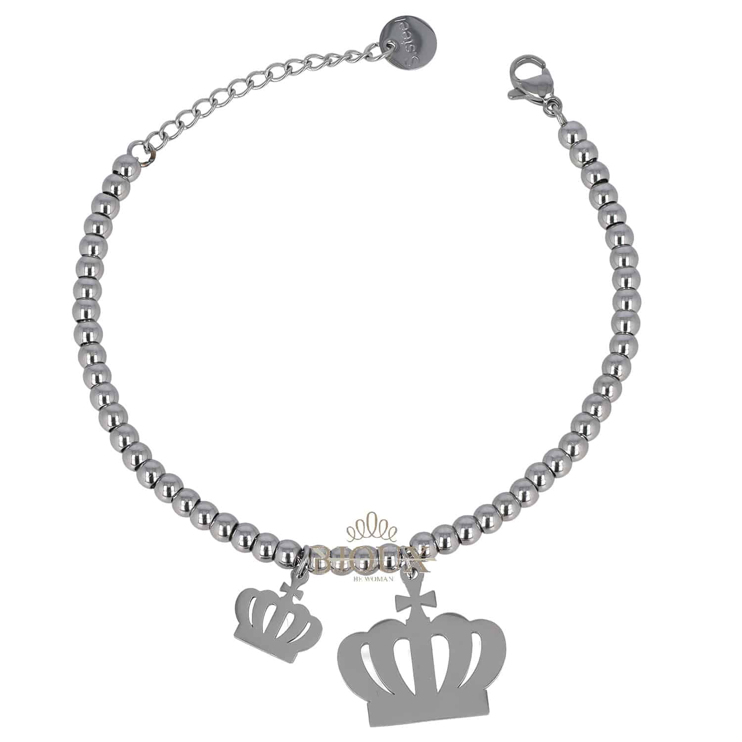 Bracciale in acciaio inossidabile a pallini con pendenti corone. Colore rodio.