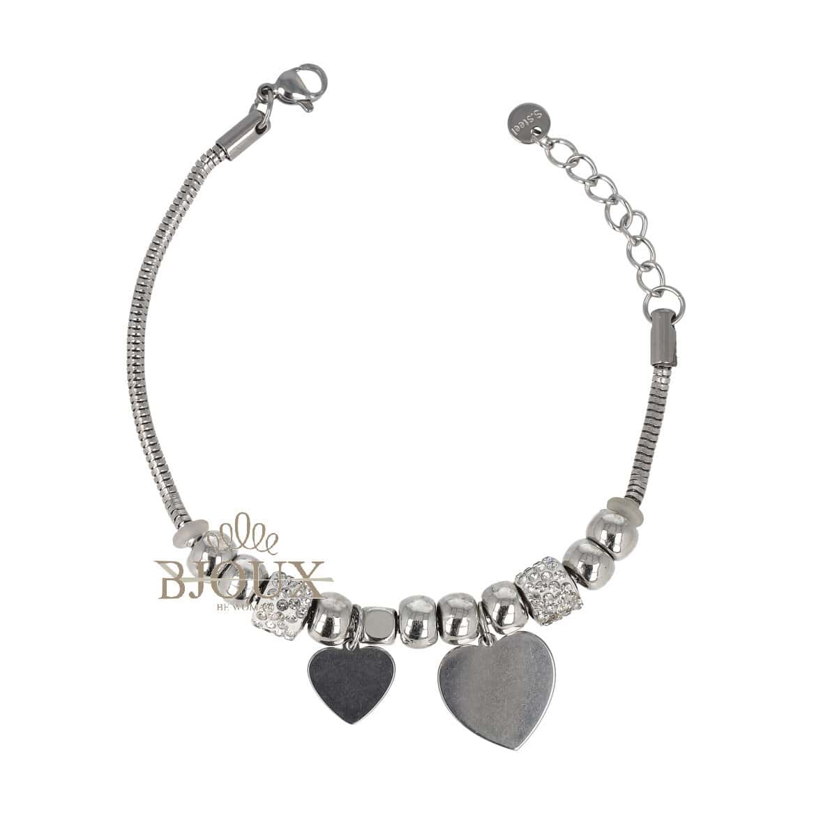 Bracciale in acciaio inossidabile catena coda di topo con beads strass e rondelle . Ciondoli due cuori