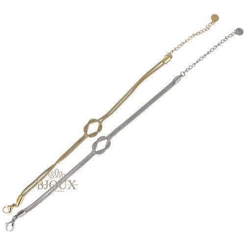 Bracciale di bigiotteria in acciaio inossidabile anallergico ,a due fili con catena coda di topo. Lunghezza 17 + 5 cm di estensione, nodo centrale da 1,5 cm
