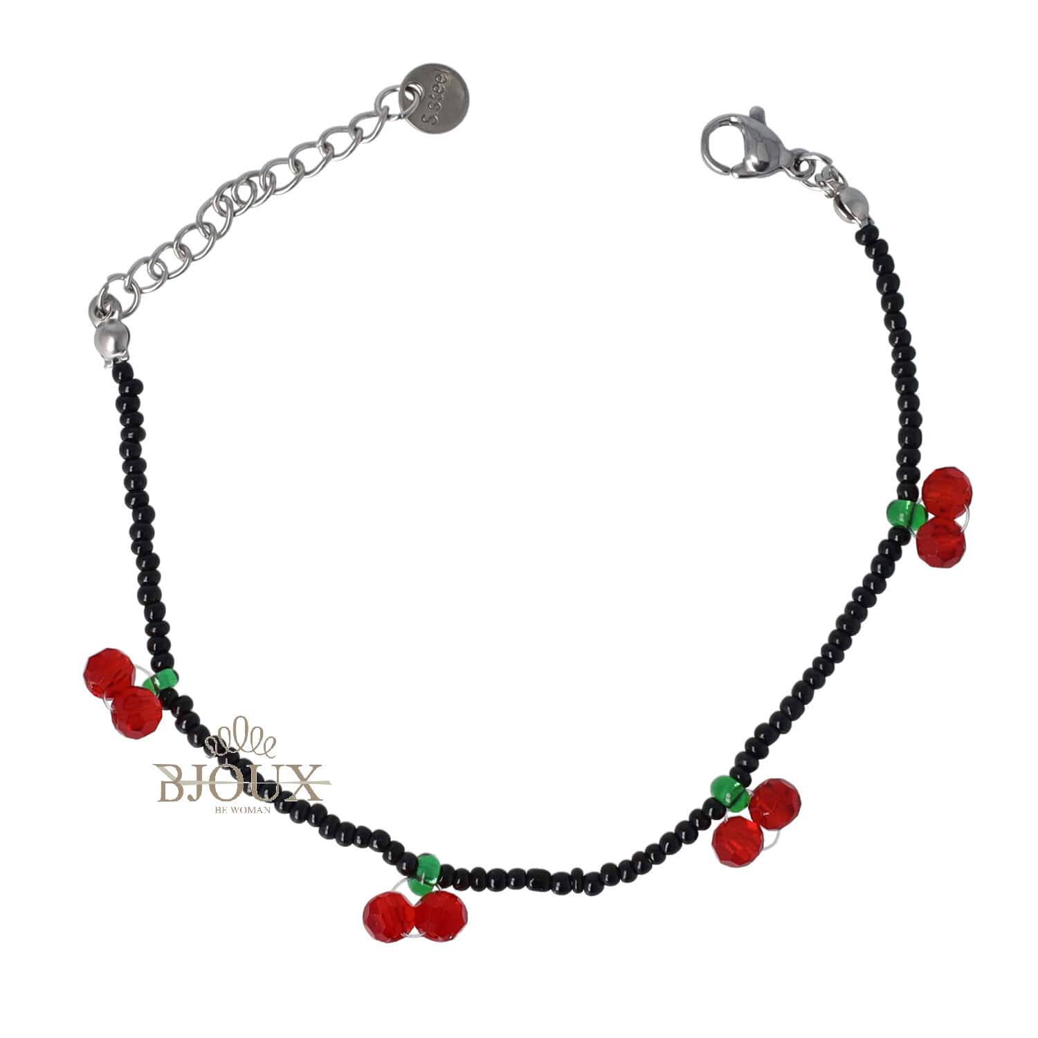 Bracciale bigiotteria in acciaio con perline colorate e mini ciliegine rosse. Disponibile vari colori.