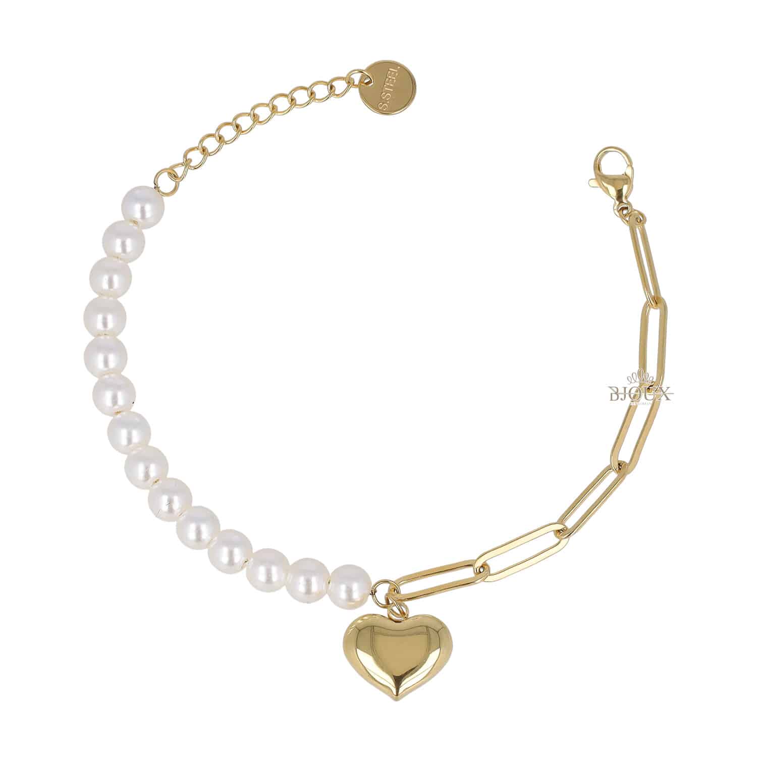 Bracciale di bigiotteria in acciaio inossidabile catenina e perle con cuore pendente. Disponibile in oro e rodio