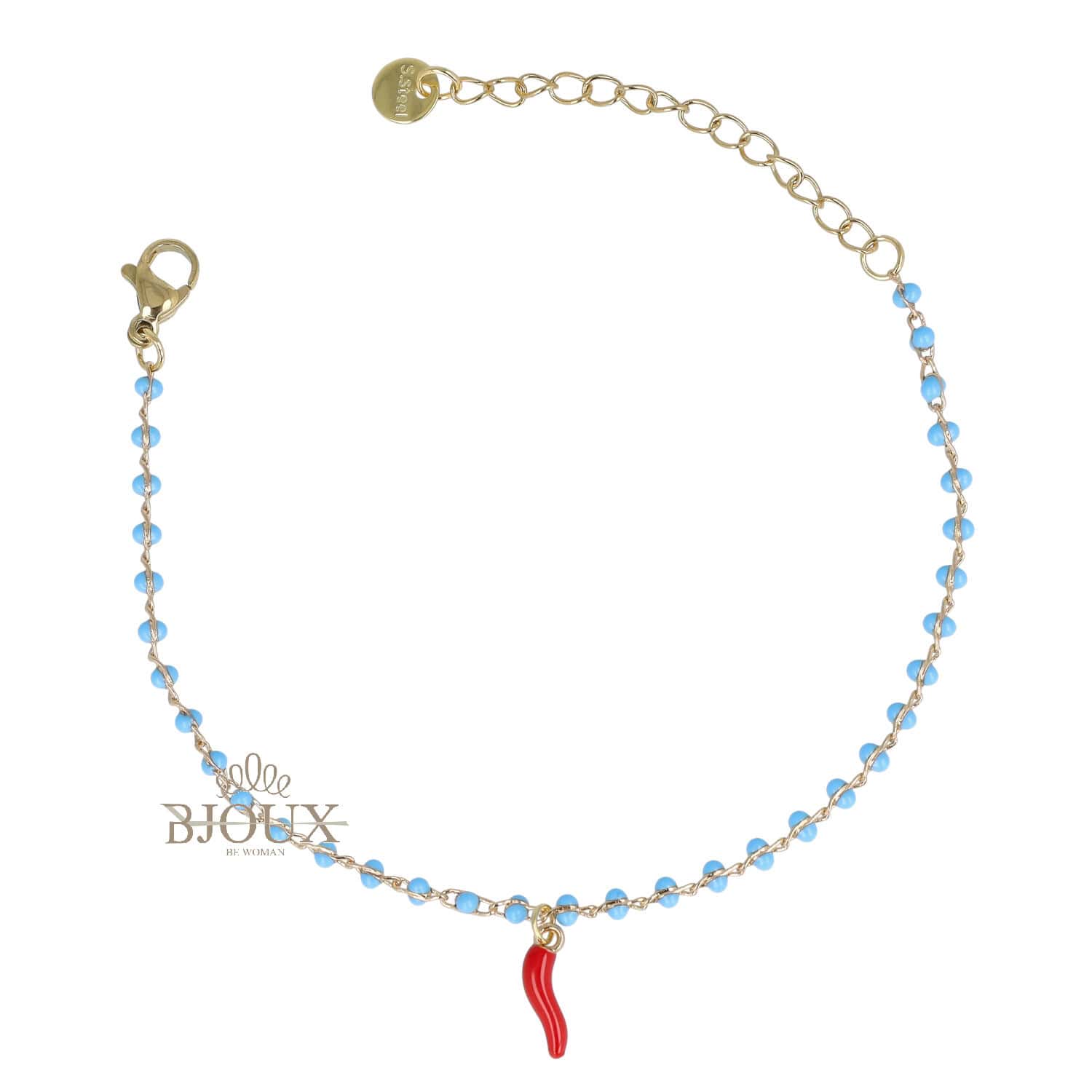 Bracciale bigiotteria in acciaio inossidabile 16+5 cm di estensione con sfere in vetro colorato e pendente corno rosso da 1 cm