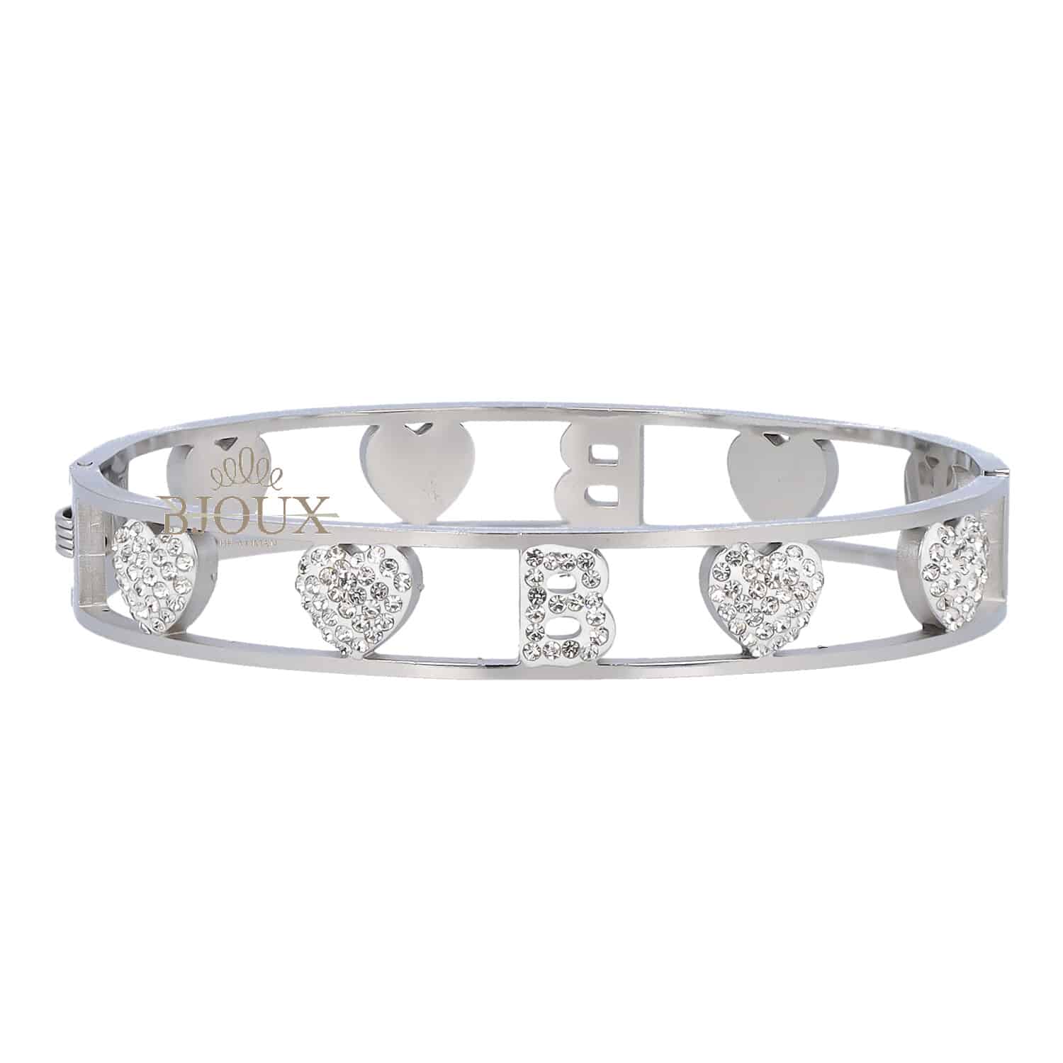 Bracciale in acciaio inossidabile bangle con lettera inziale del nome decorata da cuoricini eย strass. Colore rodio.