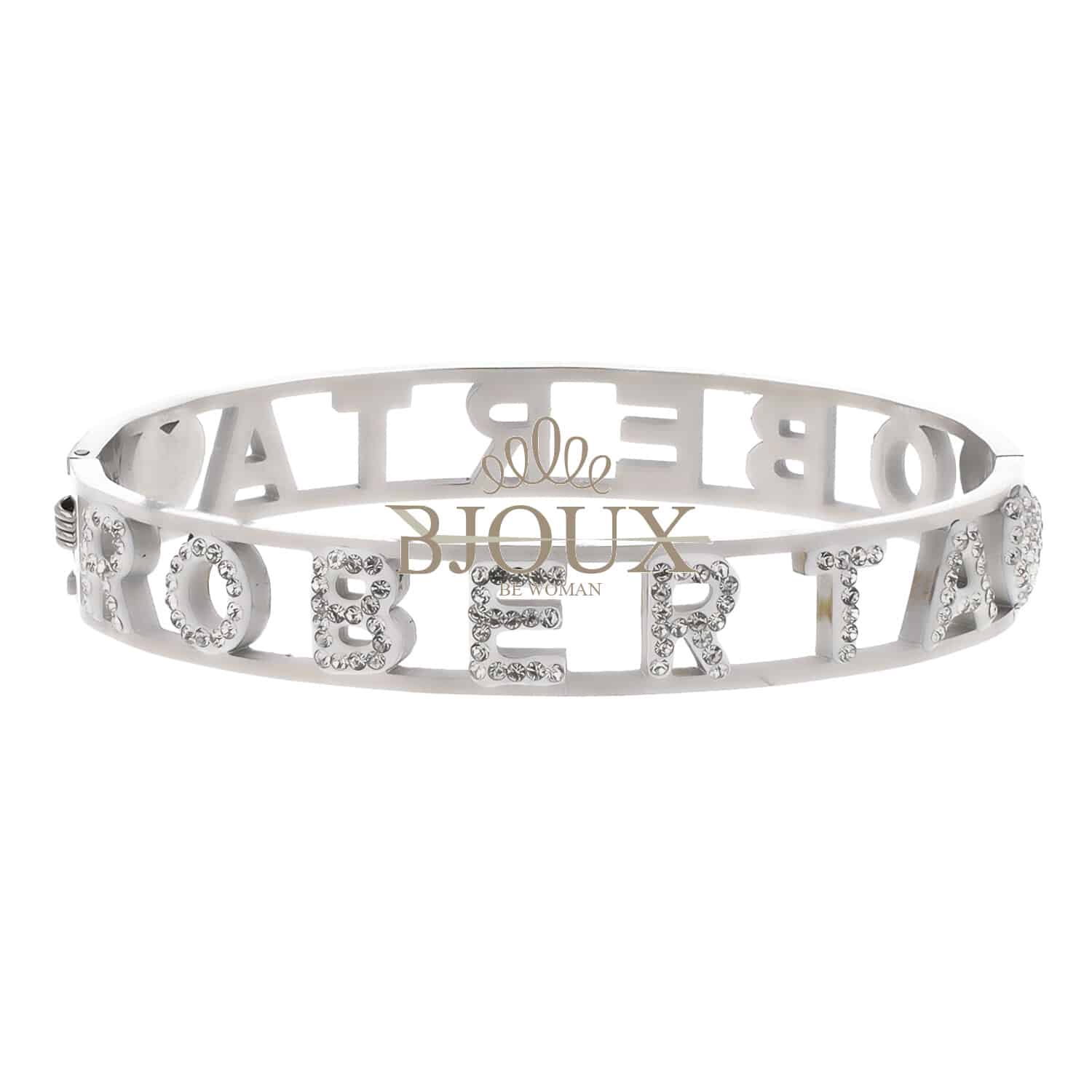 Bracciale in acciaio inossidabile bangle con nome decorato da strass. Colore rodio.