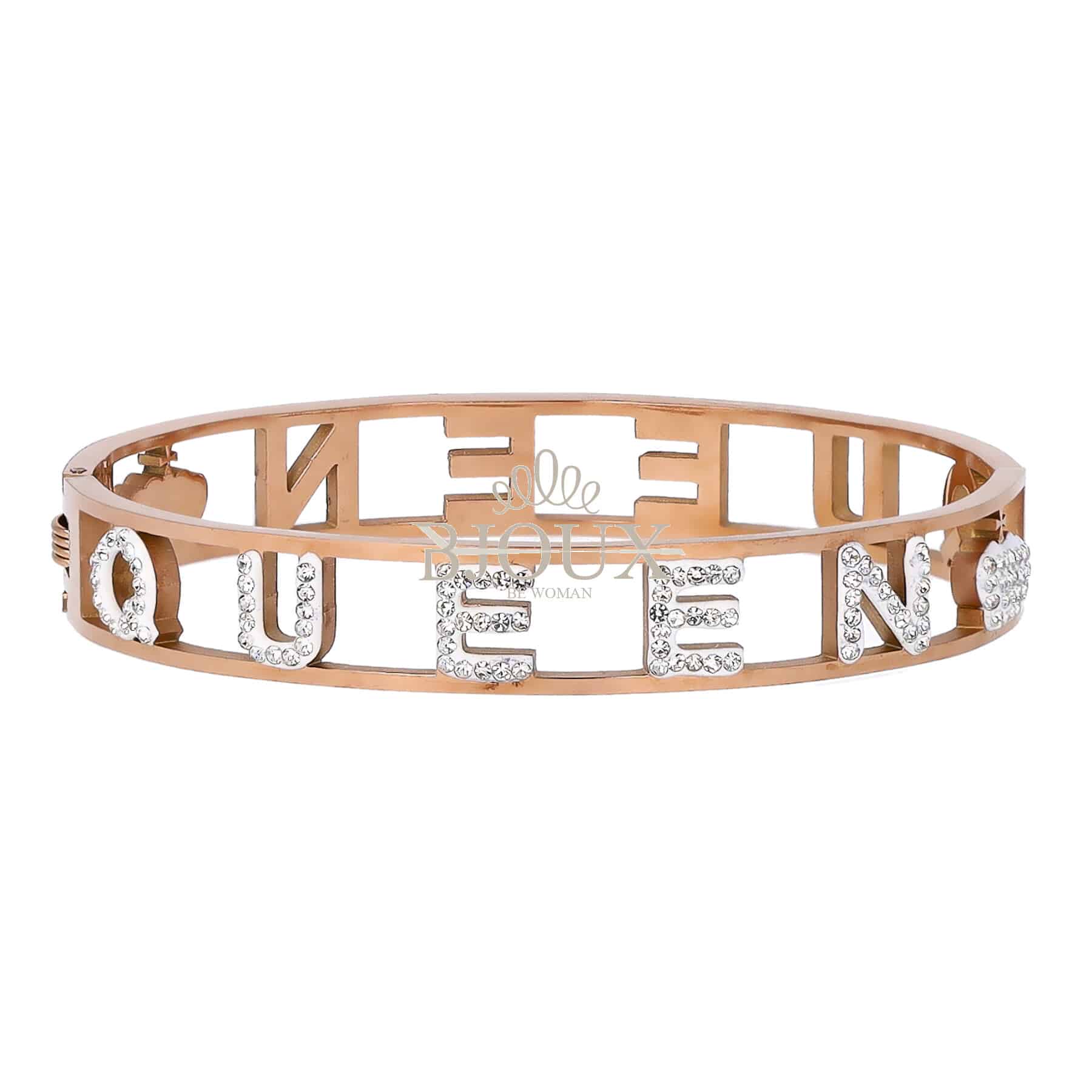 Bracciale bangle in acciaio inossidabile dipinto gold rose con chiusura a scatto. Decorato da scritta con zirconi