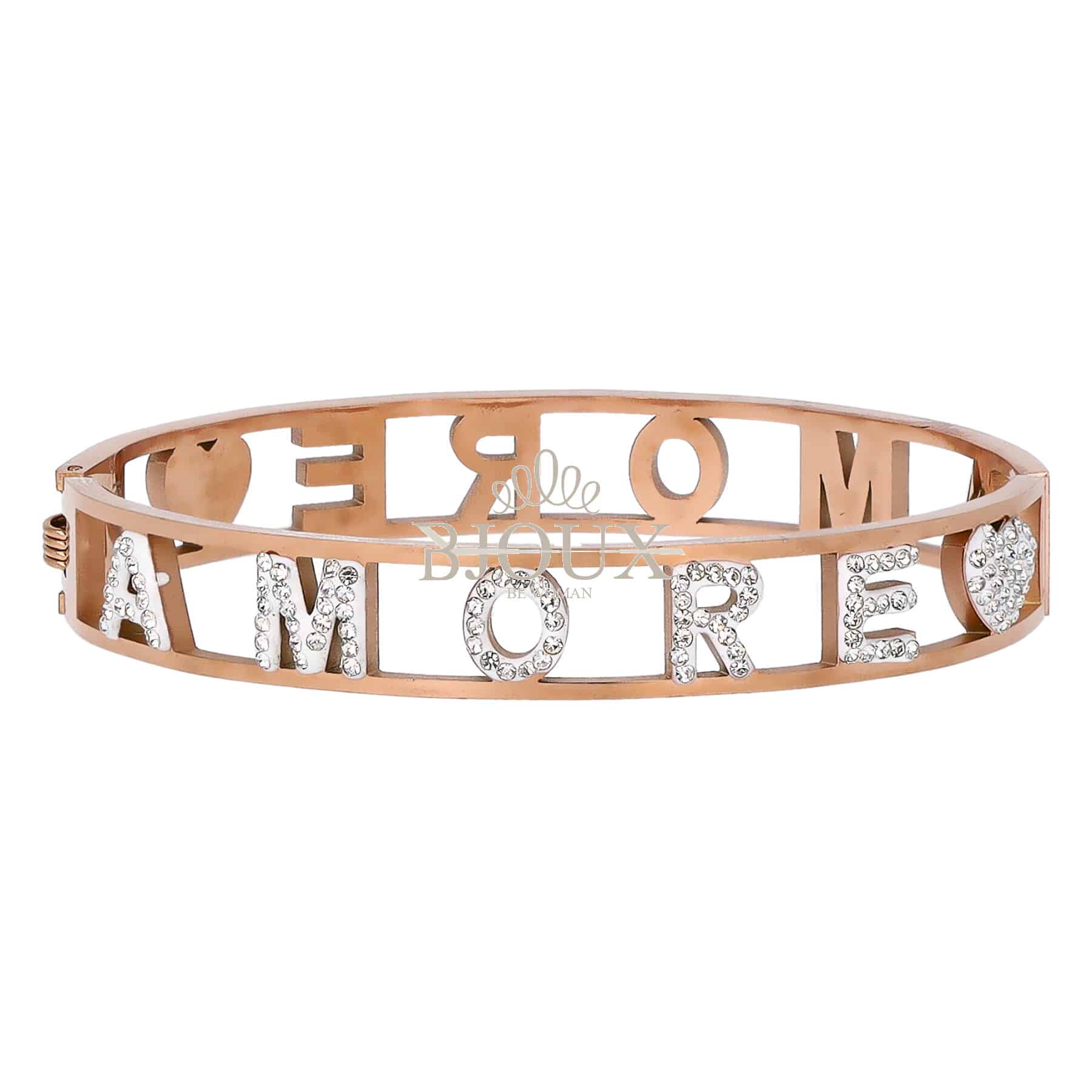 Bracciale modello bangle in acciaio inossidabile di colore oro rosa. Chiusura a scatto cons critta decorata da zirconi.