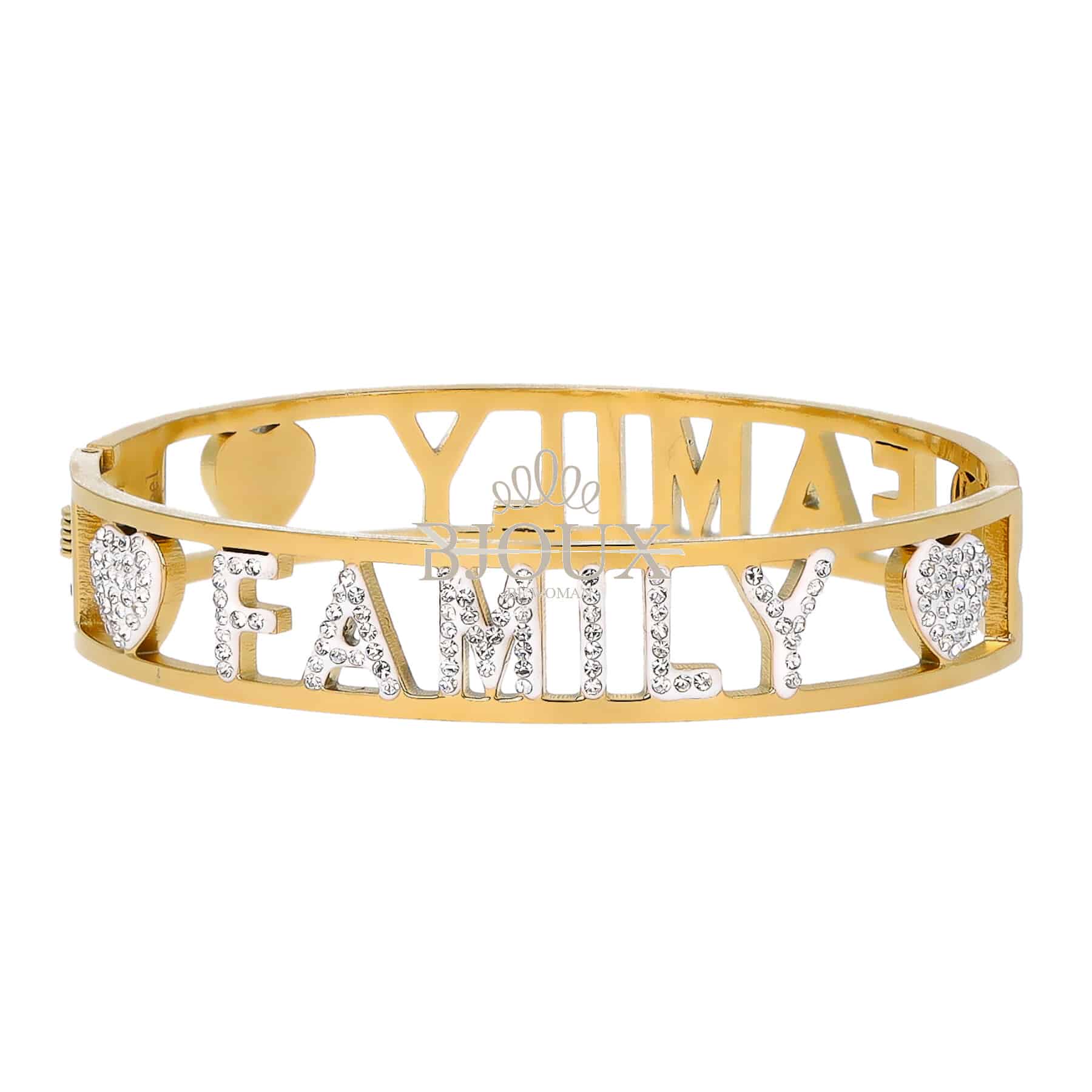 Bracciale bangle in acciaio inossidabile dipinto con chiusura a scatto. Scritta centrale FAMILY decorata da zirconi.