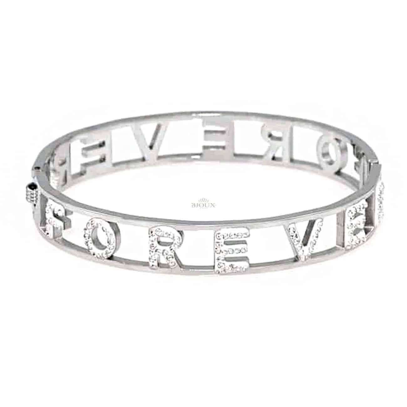 Bracciale da donna modello bangle in acciaio con scritta centrale decorata da zirconi.