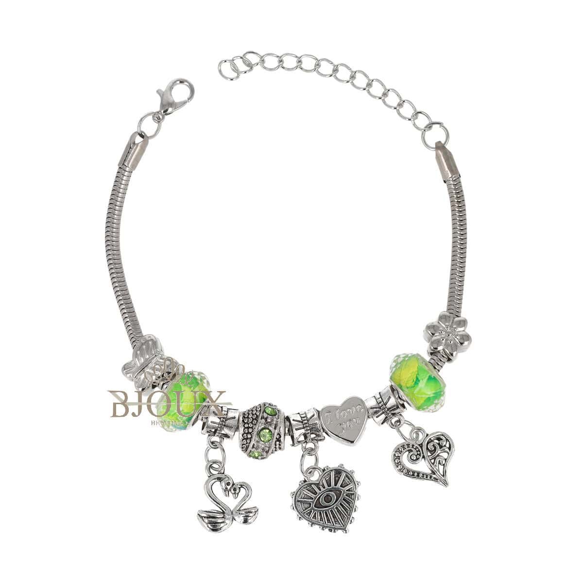 Bracciale in ottone anallergico dipinto catena coda di topo con beads colorati e charms tema farfalla e cuori