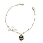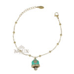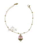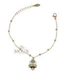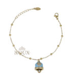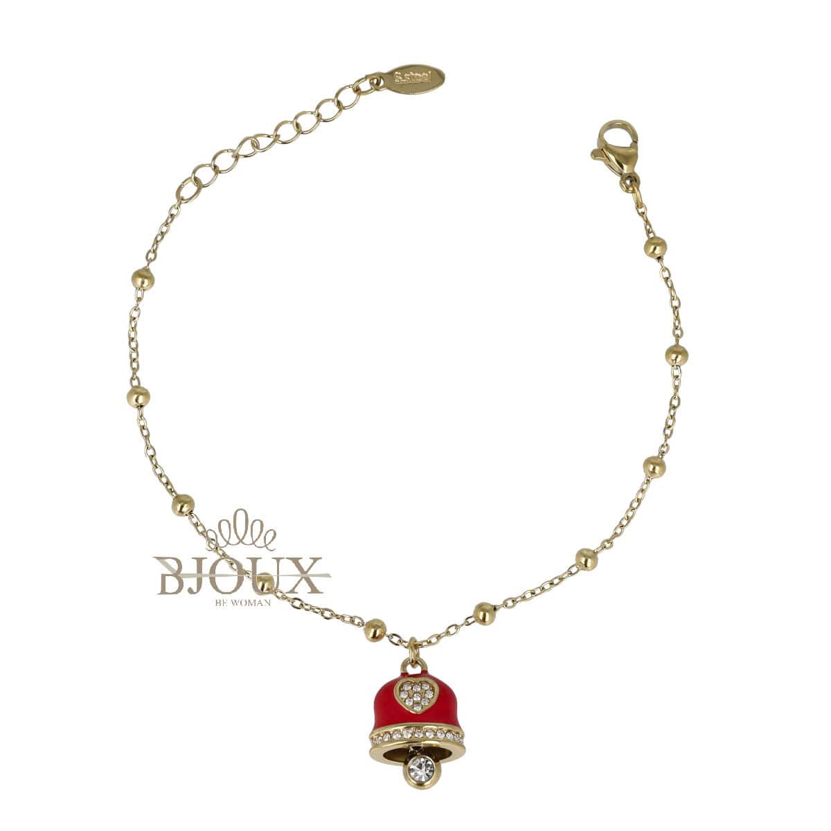 Bracciale donna con ciondolo campanella. Bracciale con catenina sottile maglia a sfere alternate a piccoli anellini tipo catena rosario. Al centro pende una campanella in stile Capri, smaltata ย e decorata con un cuore composto da piccoli strass
