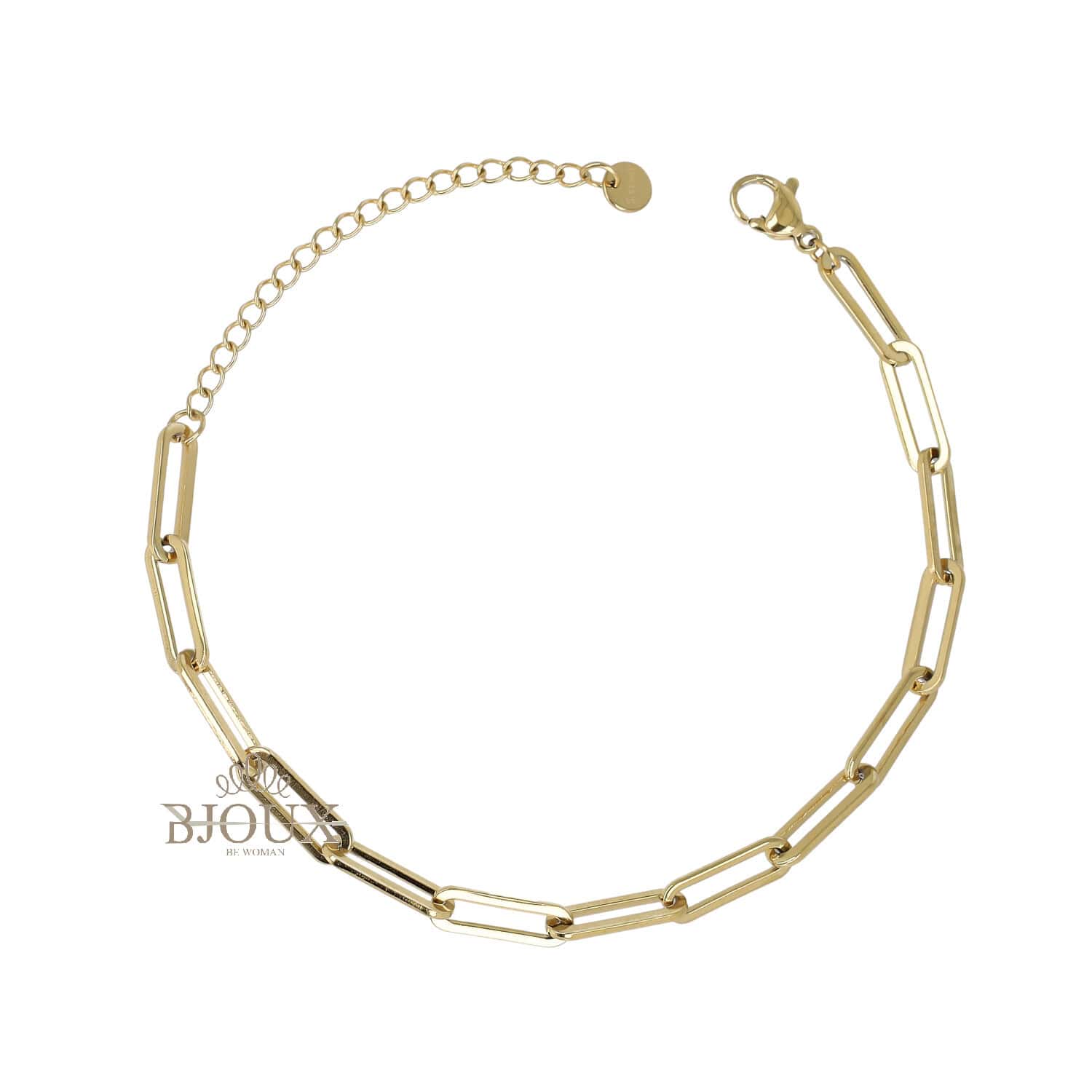 Bracciale in acciaio inox anallergico, disponibile in finitura oro o argento, con maglie rettangolari allungate. Design moderno e minimal, ideale per abbinamenti quotidiani.