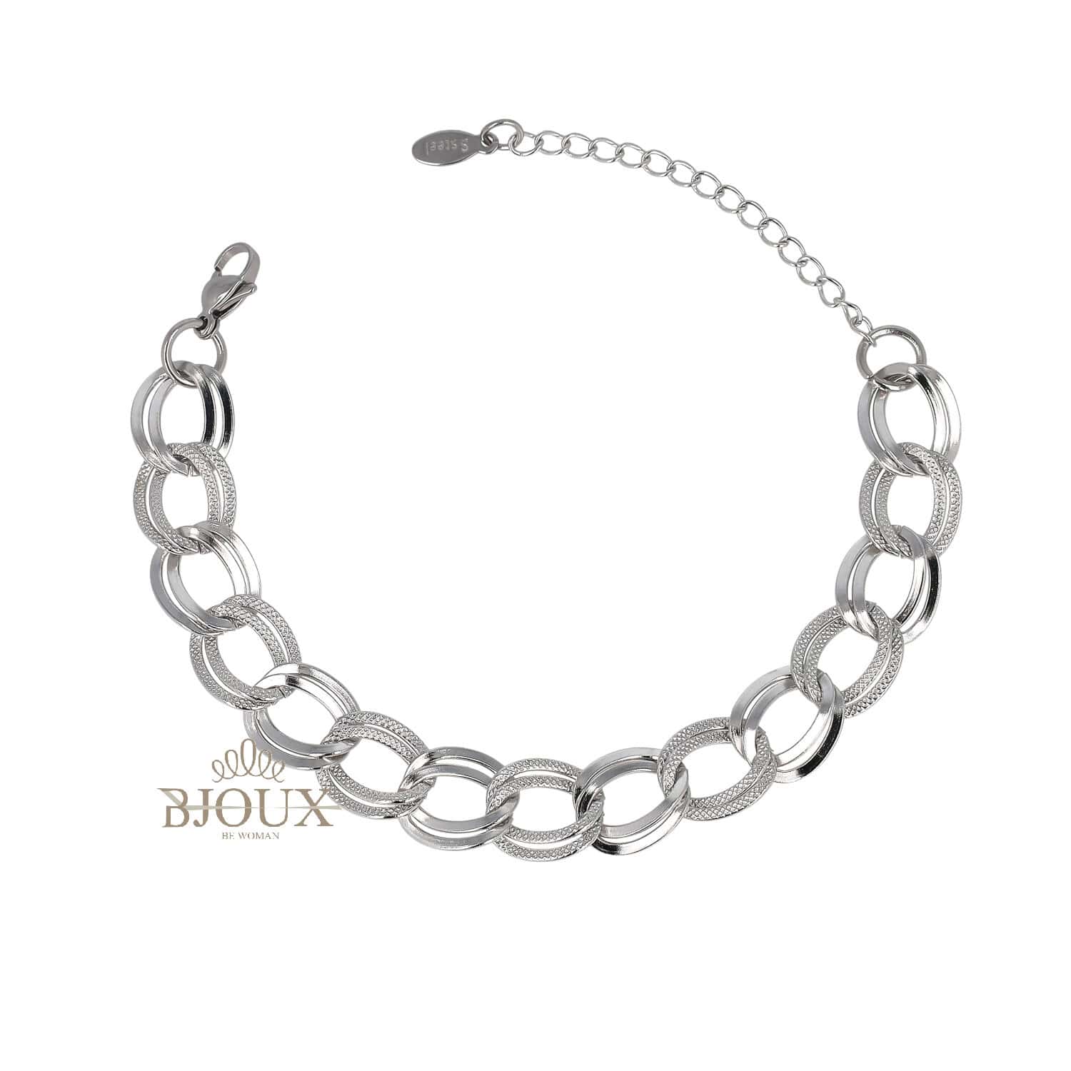 Bracciale realizzato in acciaio inox anallergico, disponibile oro o argento, con grandi maglie tonde alternate lucide e lavorate. Modello dal carattere deciso, adatto a collezioni fashion.