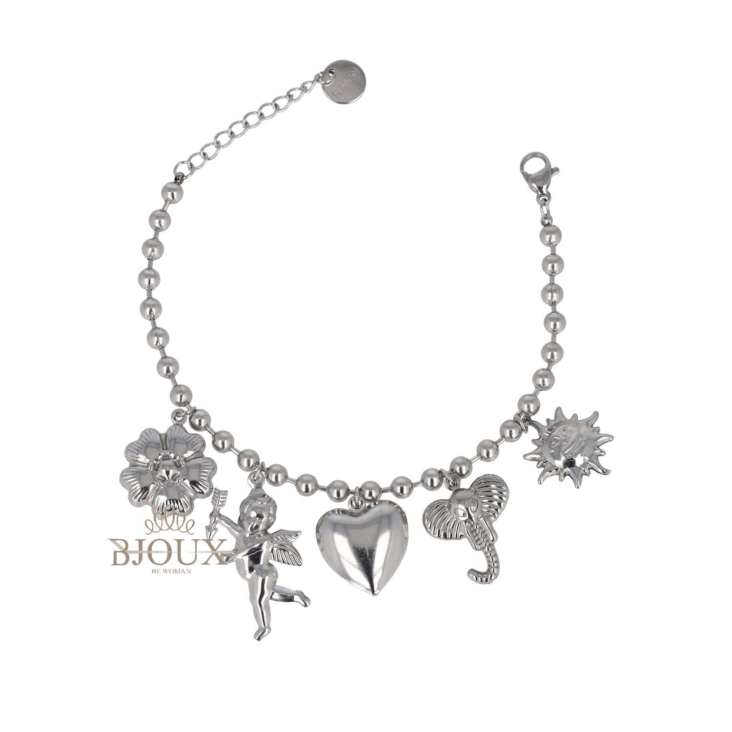 Bracciale in acciaio con catena a sfere e charms grandi: sole, cuore, fiore, elefante e angioletto. Un bijoux originale e ricco di dettagli.