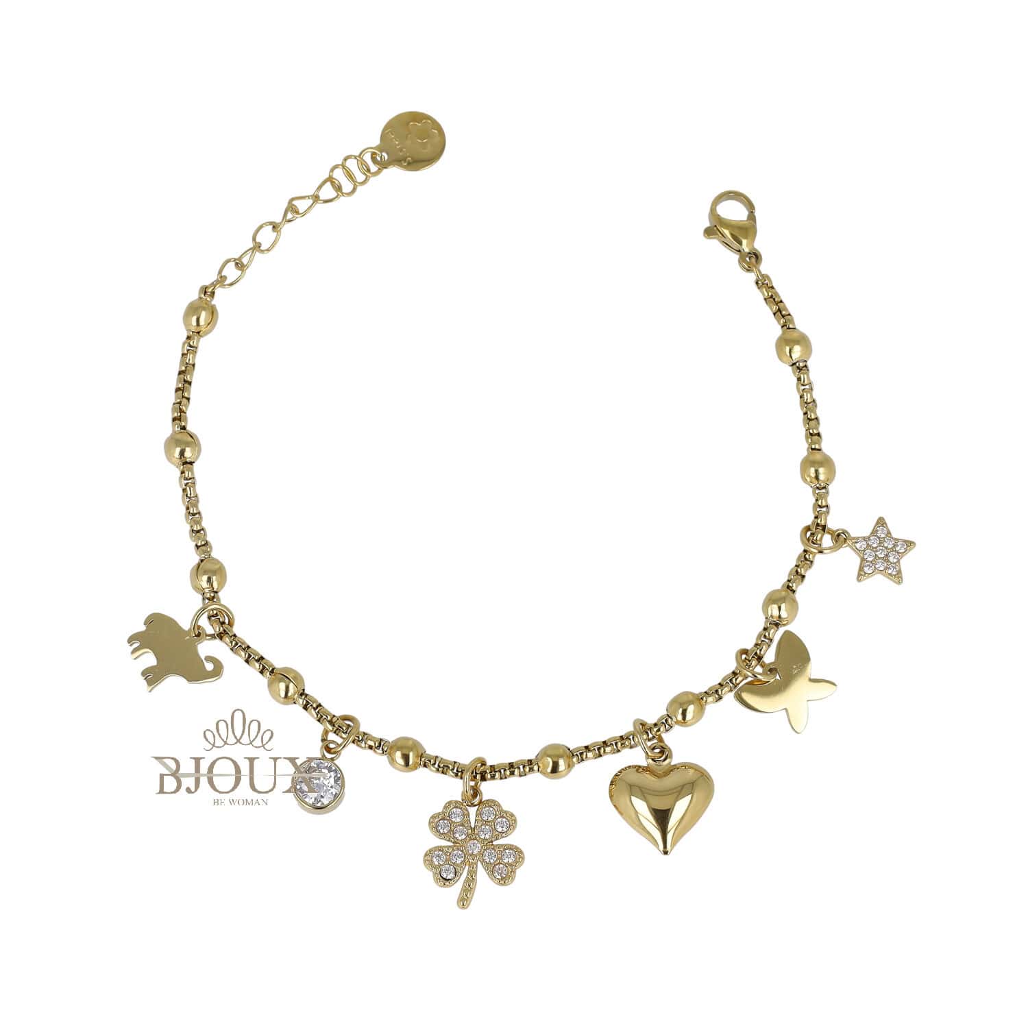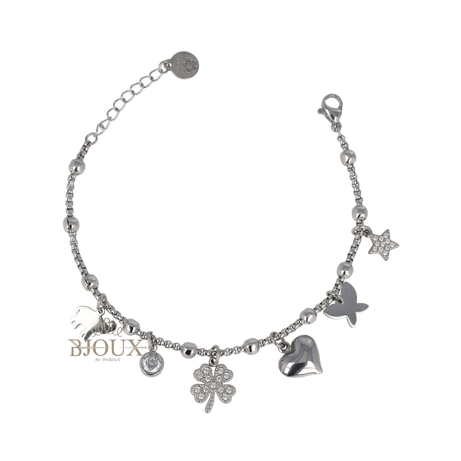 Bracciale catenina a pallini in acciaio inossidabile, 17+5 cm estensione. Charms assortiti con decoro di strass.