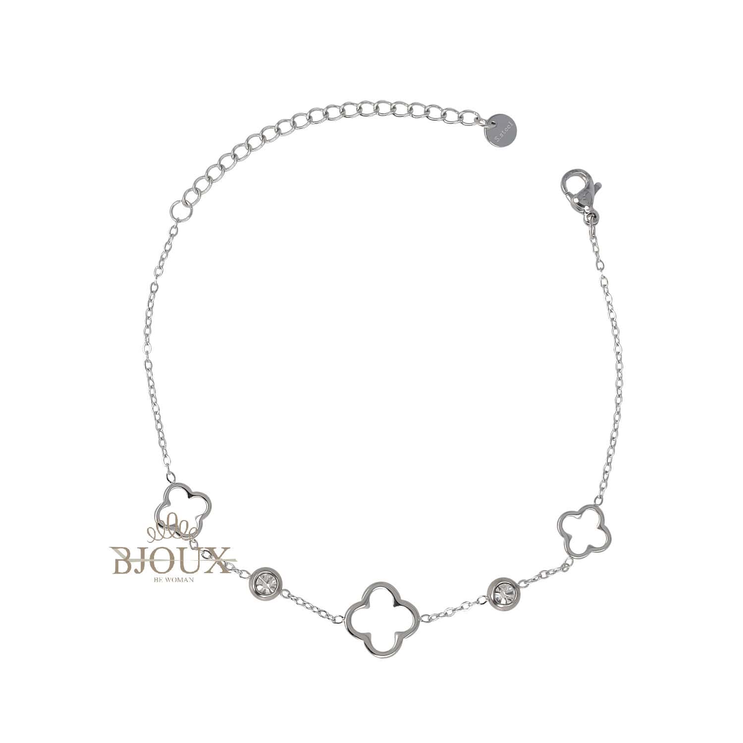 Bracciale sottile in acciaio inox anallergico, disponibile in oro o argento, con elementi a quadrifoglio e zirconi incastonati. Elegante e raffinato, adatto a collezioni chic.
