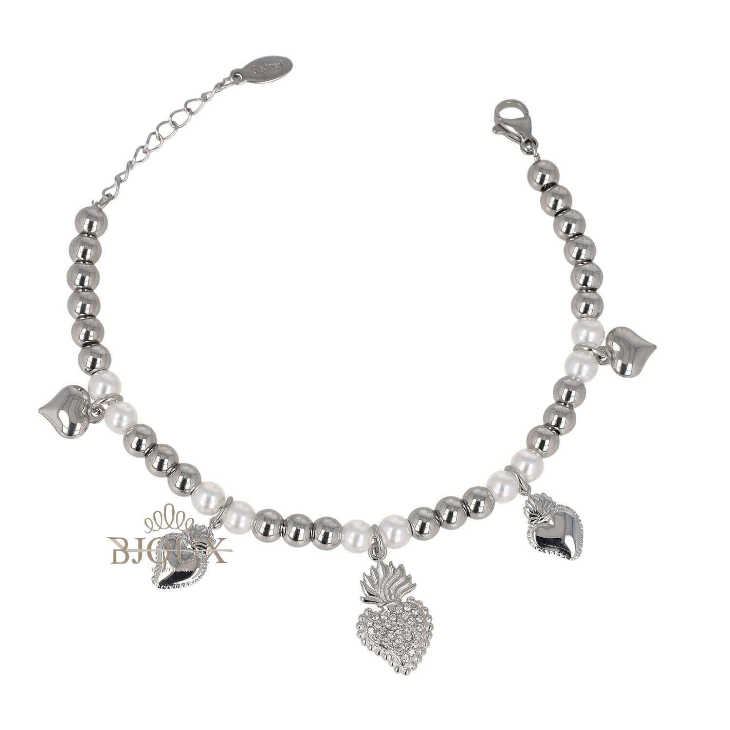 Bracciale in acciaio inox con sfere alternate a perle e ciondoli pendenti a cuore sacro decorati da zirconi. Disponibile in oro e argento.