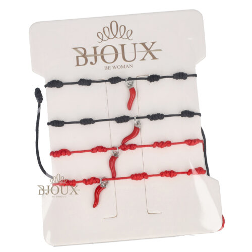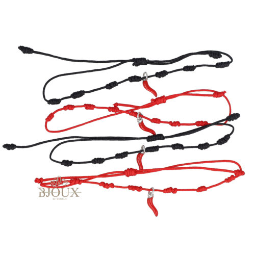 Braccialetti regolabili con laccetto colorato corallini e corno rosso da 1 cm. Card da 4 pezzi colori come da foto