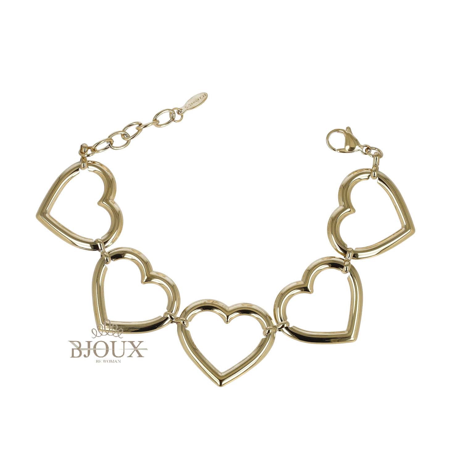Bracciale in acciaio inox anallergico, disponibile in finitura oro e argento, con grandi cuori vuoti collegati tra loro. Design romantico e accattivante, perfetto come accessorio moda.