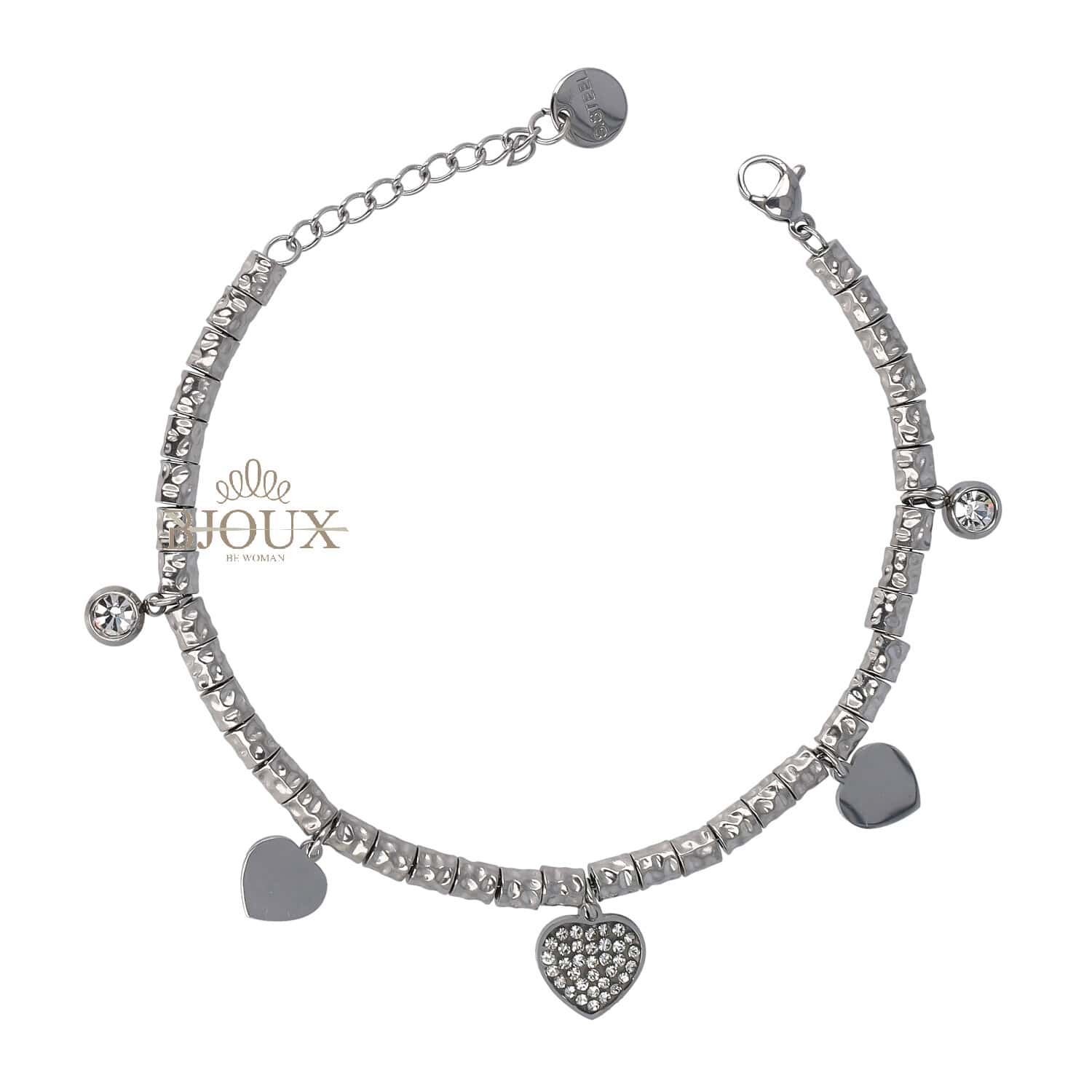 Bracciale bijoux in acciaio inossidabile composto da catenina con estensione da 3 cm e dadini, ciondoli cuori e punti luce.
