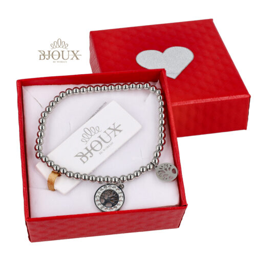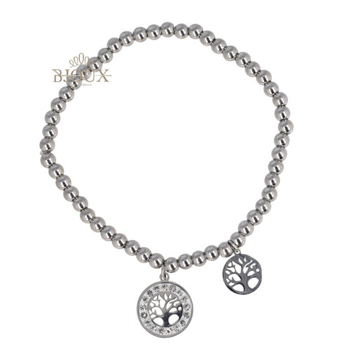 Bracciale in acciaio inossidabile a pallini modello elastico con pendenti albero della vita. Astuccio 7×7 cm