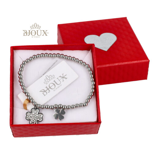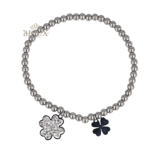 Bracciale in acciaio inossidabile a pallini modello elastico con pendenti quadrifogli. Astuccio 7×7 cm