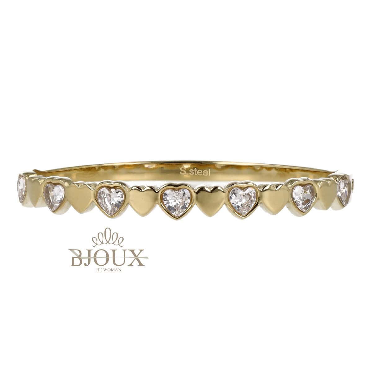 Bracciale rigido in acciaio inossidabile. Bracciale rigido a ย fascia realizzato in acciaio inossidabileย caratterizzato da una fila continua di cuori e castoni a forma di cuore