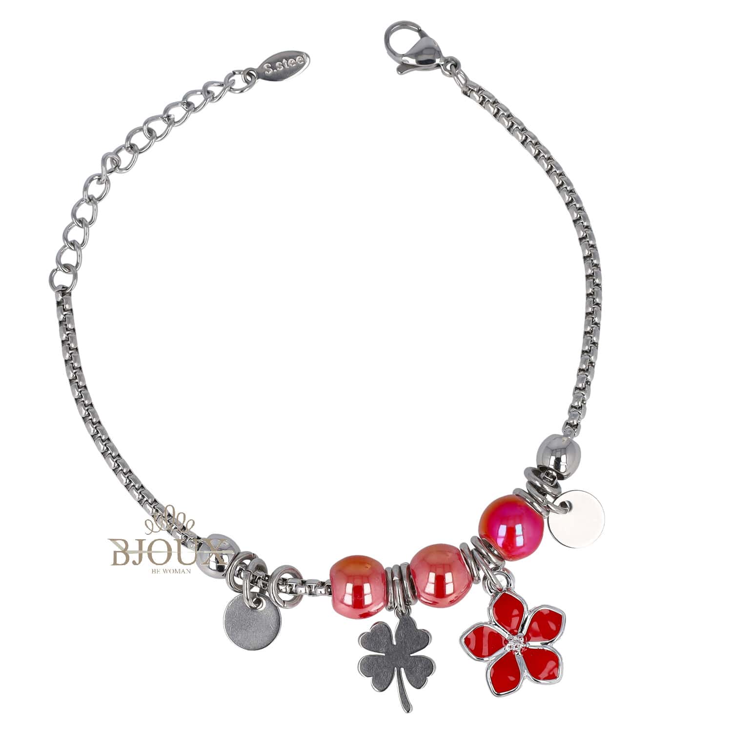 Bracciale in acciaio catena con misura regolabile, sfere colorate e fiore smaltato con quadrifoglio