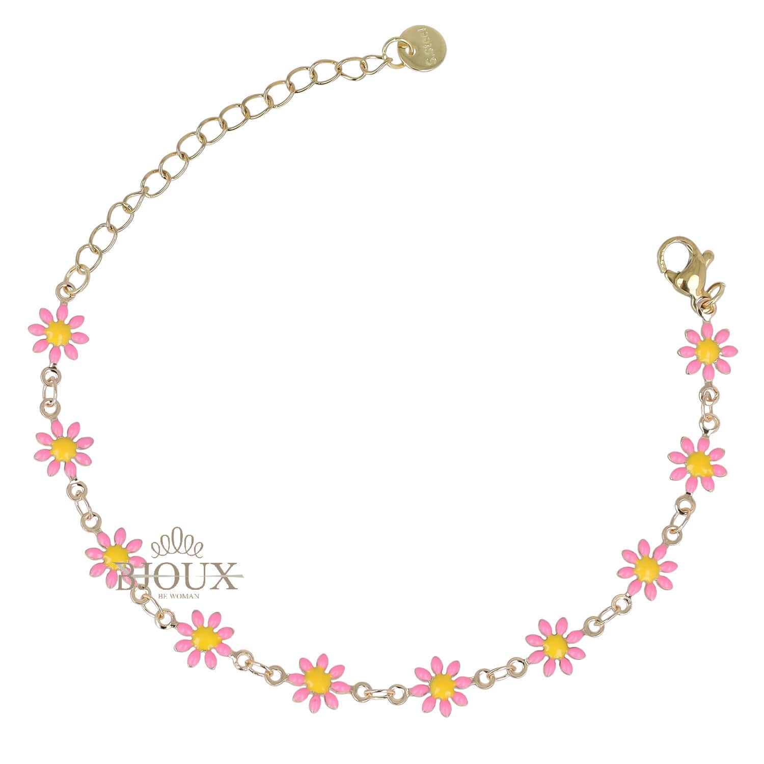 Bracciale di bigiotteria in acciaio inossidabile con margherite colorate. Base oro