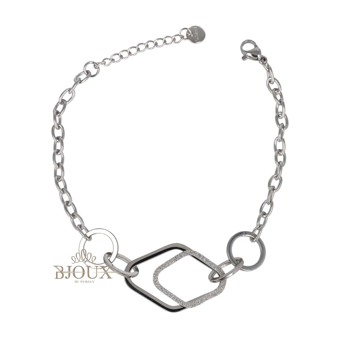 Bracciale in acciaio inox con catena a maglie e centrale geometrico formato da cerchi e rombo satinato. Disponibile in oro e argento.