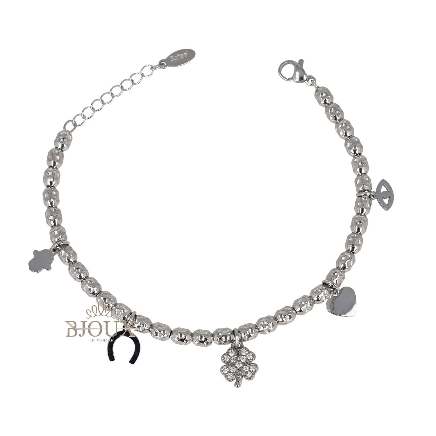 Bracciale in acciaio inox finitura argento con sfere e ciondoli pendenti portafortuna: quadrifoglio con zirconi, ferro di cavallo , cuore, tartaruga e simbolo occhio.