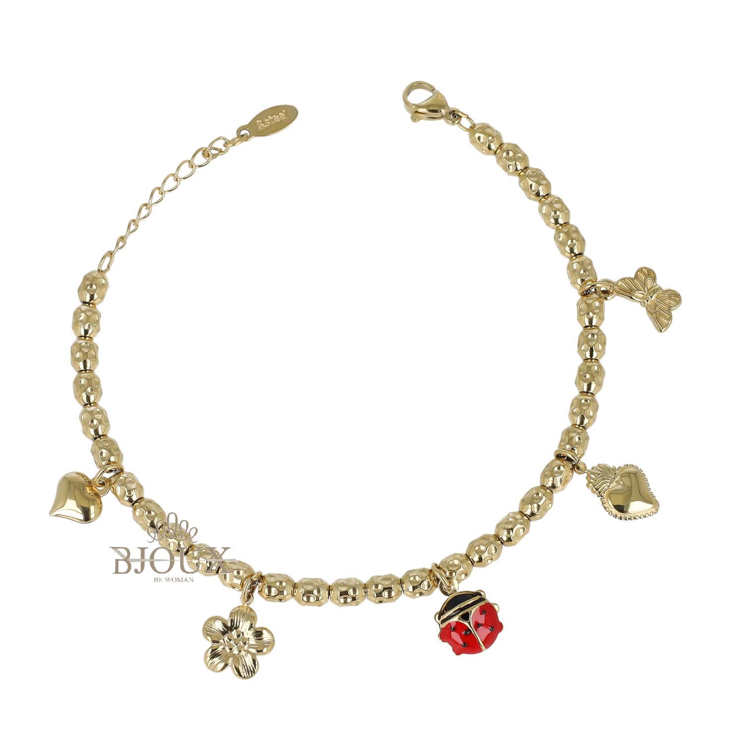 Bracciale in acciaio inox con sfere tipo dodo e ciondoli pendenti (cuore, fiore, coccinella smaltata, cuore sacro, quadrifoglio). Disponibile in oro e argento.