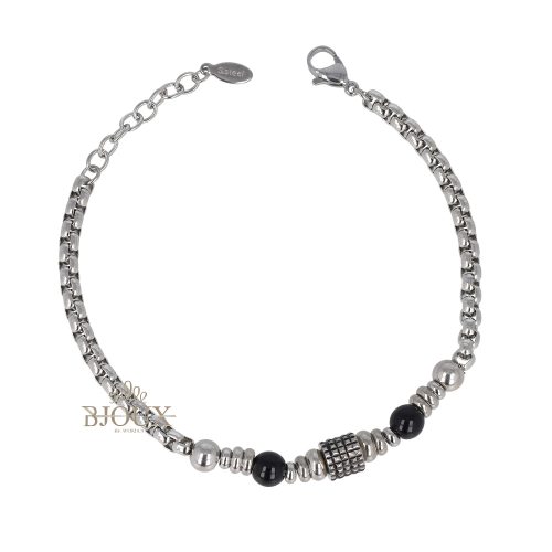 Bracciale in acciaio inossidabile a catena con barilotti rodiati, sfere e rondella lavorata. Completo di astuccio 21×4,5×2,5 in colore blu