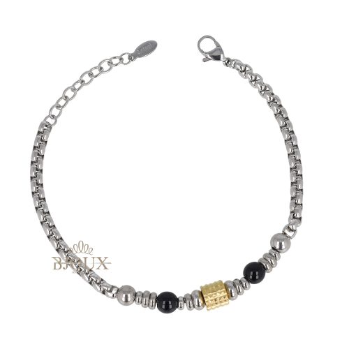 Bracciale in acciaio inossidabile a catena con barilotti rodiati, sfere e rondella lavorata. Completo di astuccio 21×4,5×2,5 in colore blu