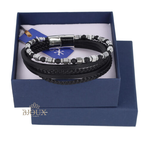 Bracciale di bigiotteria in pelle nera da uomo. Bracciale con intreccio e centrale acciaio inossidabile a più fili