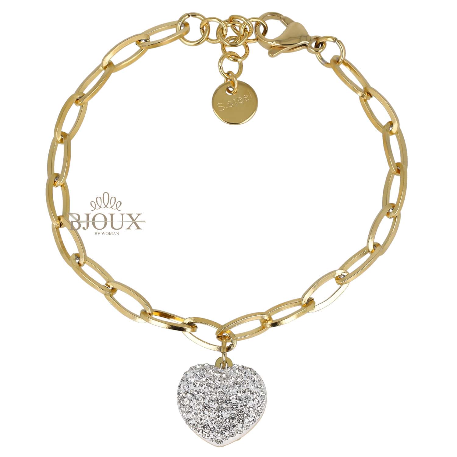 Bracciale da donna in acciaio inossidabile a catena colore gold con ciondolo a cuore strass. Chiusura a gancio.